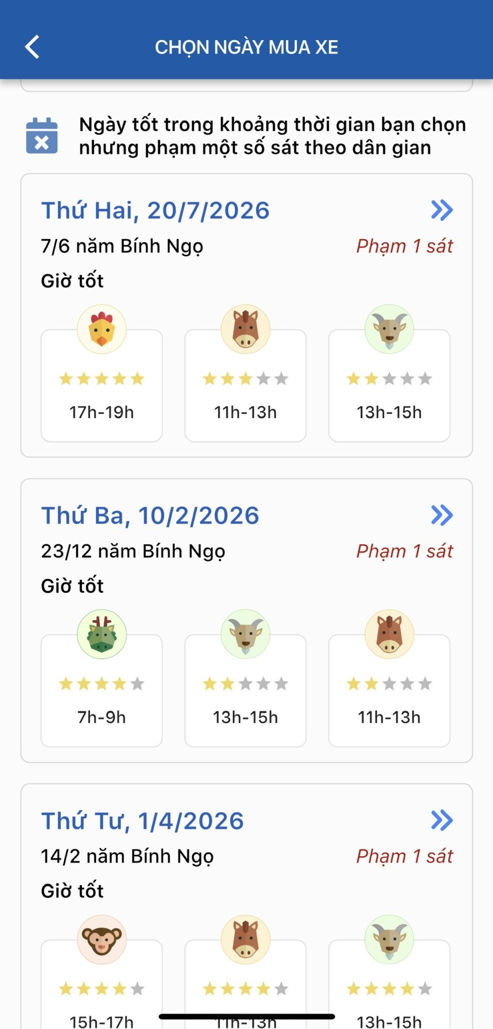 Đặc biệt hơn, Lịch Việt hiểu rằng đôi khi công việc bận rộn khiến bạn khó lòng chọn đúng những ngày hoàn hảo nhất. Vì vậy, ứng dụng cũng gợi ý thêm một số ngày tốt thứ yếu – tức là những ngày khá đẹp nhưng có thể phạm một vài sao nhỏ không quá đáng ngại. Điều này giúp bạn linh hoạt hơn trong việc sắp xếp kế hoạch với bên đại lý xe mà vẫn đảm bảo nằm trong khung giờ an toàn, hanh thông.